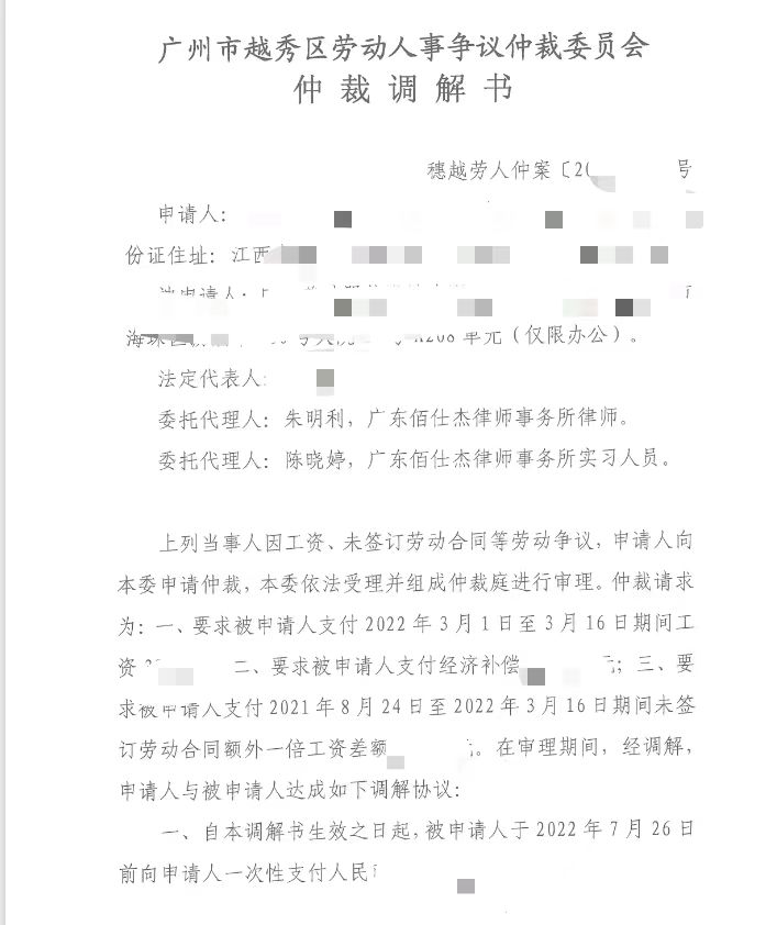 廣州企業(yè)法律顧問律師團隊依法接受某公司的委托,指派朱明利律師為公司提供法律幫助。接受委托后,廣州企業(yè)法律顧問律師團隊依法在廣州市越秀區(qū)勞動人事爭議仲裁委進行調解,通過廣州企業(yè)法律顧問律師的不斷的努力下,員工同意和公司調解,并愿意和公司達成和解,為企業(yè)減少一定的損失。